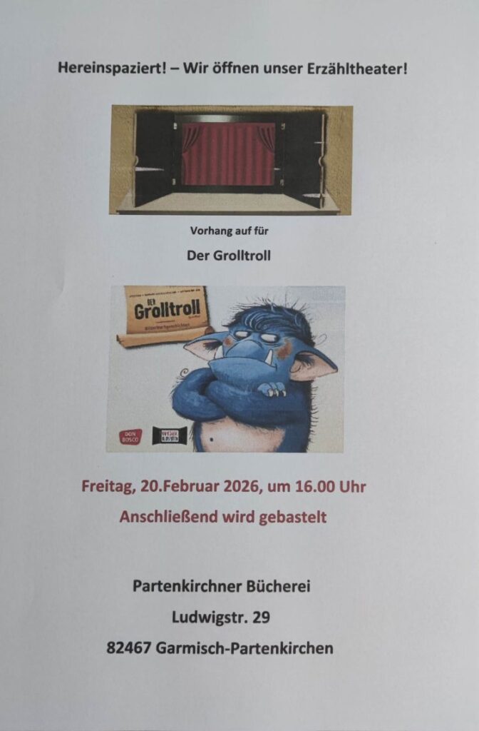 Freitag, 20. Februar 2026, 16.00 Uhr in der Partenkirchner Bücherei. Anschließend wird gebastelt!